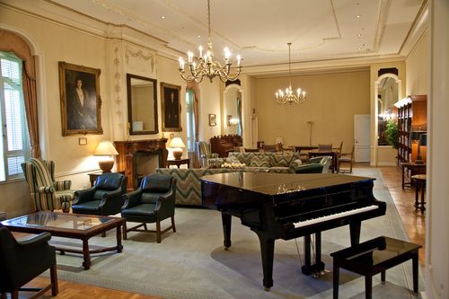 The second floor, which is reached by both elevator and staircase, was for many years devoted entirely to Countess Doheny's collections of rare books and objects of art. On the left of the oval hall is the salon. Originally, chandeliers lent this room great dignity. Decorated in the style of Louis XV, it was furnished with gold furniture of that period, as well as jade carvings, Sevres vases and other objects of art. Portraits of the Dohenys hang on either side of the massive fireplace. The Library salon now contains the audio and video collection and is used for some formal gatherings, including music recitals.